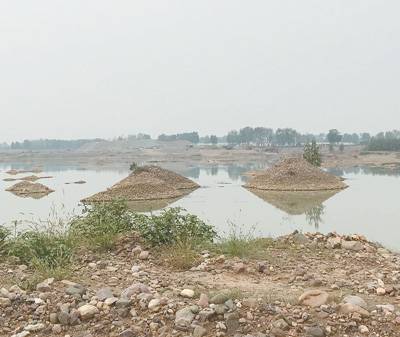 沙河河道被砂石运输路截断,河道内有很多砂石堆。