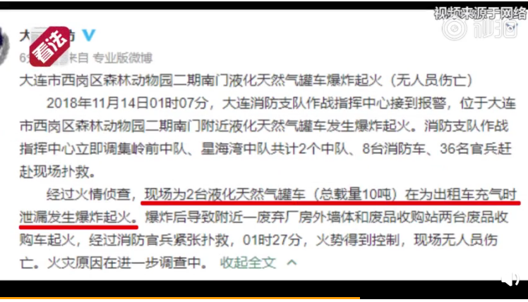大连市两台液化天然气罐车爆炸 现场火光冲天 幸无人员受伤,【大连市两台液化天然气罐车爆炸 现场火光冲天 幸无人员受伤】11月14日01时,位于大连市西岗区森林动物园二期南门附近液化天然气罐车发生爆炸起火。消防支队作战指挥中心立即调集2个中队、8台消防车、36名官兵赶赴现场扑救。经过火情侦查,现场为2台液化天然气罐车(总载量10吨)在为出租车充气时泄漏发生爆炸起火。爆炸后导致附近一废弃厂房外墙体和废品收购站两台废品收购车起火,经过消防官兵紧张扑救,01时27分,火势得到控制,现场无人员伤亡。火灾原因在进一步调查中。