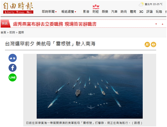 值得注意的是,上述消息都是关于美国航母在南海的活动,并非台海。台湾媒体的报道倒很活跃,甚至有些硬拗。比如,台湾《自由时报》就要强调,美国航母进入南海是在“台湾选举前夕”。