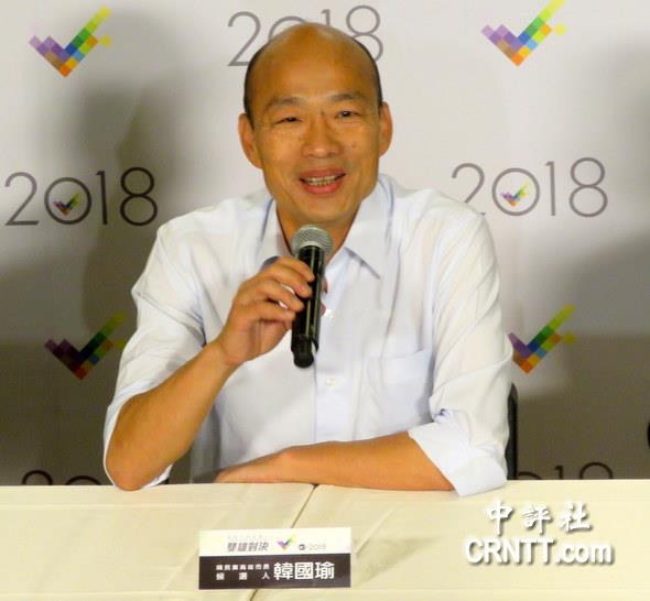 【观察者网综合报道】香港中评社11月19日报道,台湾三立电视台19日晚上主办“双雄对决世纪首辩”2018高雄市长辩论会,针对民进党陈其迈质疑其两岸政策,中国国民党候选人韩国瑜在第二阶段交叉诘问强调,自己从选举开始就说“东西卖得出去,人进得来,高雄发大财”,所以他认同“九二共识,一中各表”,因为热爱中华。