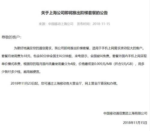 早在上个星期,中国移动上海公司就发布将推出阶梯套餐的公告。套餐之外的国内手机上网流量采取单价模式收费,根据用户每月使用量分为4档,为0.1元/MB,0.03元/MB,0.01元/MB和0.005元/MB。中国移动在公告中表示“用多少就付多少钱,越用越便宜。”