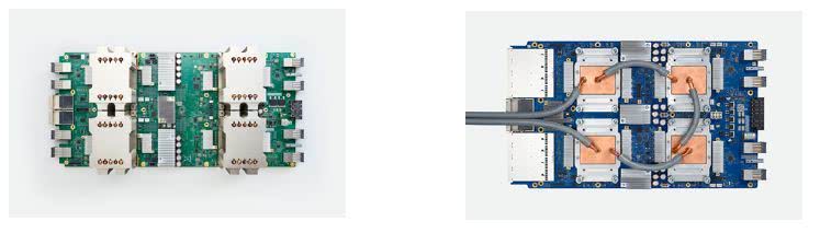 图:左图为 4-chip 的云 TPU v2 设备,峰值计算能力为 180 teraFLOPS(每秒万亿次浮点运算),使用 64GB 的 HBM(高带宽内存);右图为使用水冷的 4-chip 云 TPU v3 设备,峰值计算能力为 420 teraFLOPS,使用 128GBHBM。TPU v2 设备可组成最高 256-chip 的计算集群,称为 TPU Pod,可提供高达 11.5petaFLOPS 的混合精度吞吐量。TPU v3 Pod 的规模可达 1024-chip,是 TPU v2 Pod 的四倍,理论上可提供 107.5 petaFLOPS 的混合精度吞吐量