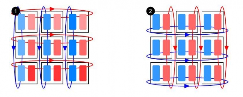 图:二维环形梯度传播,第一阶段,蓝色张量在 Y 轴方向进行求和,红色张量在 X 轴方向进行求和。第二阶段,维度进行转换再次求和。