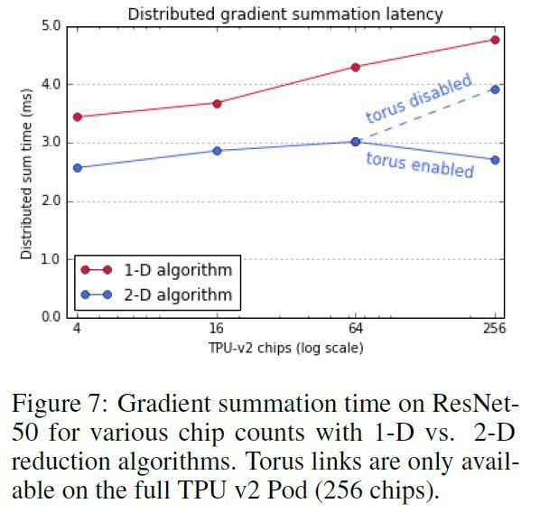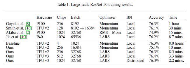 分层自适应速率缩放(LARS): 尽管使用动量(momentum)的随机梯度下降算法已经可以将 batch 最高设为 8192,但使用 LARS 优化器可以达到 32786 的 batch size 并且对于模型质量没有影响。更大的 batch size 也增加了模型在 TPU 集群上执行时的吞吐量。