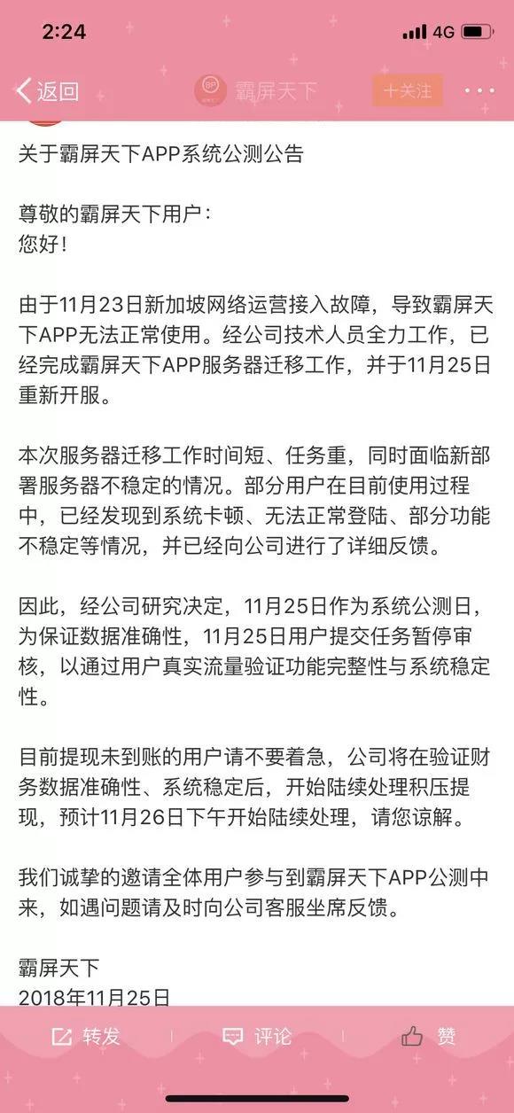 昨日,这个“霸屏天下”发了一份公告,称“网络运营接入故障”。