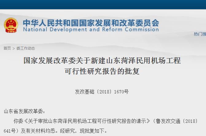 人民网济南11月28日电(王吉全) 11月27日,国家发展改革委在官网公布了对新建山东菏泽民用机场工程可行性研究报告的批复,同意新建山东菏泽民用机场,项目总投资达18.23亿元。