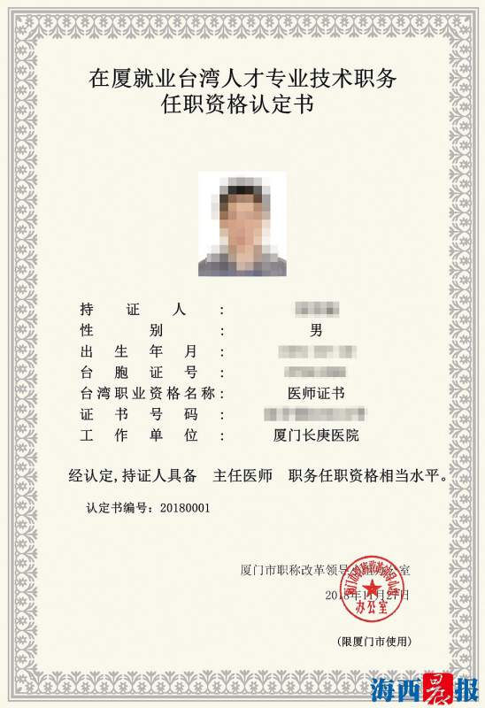 据了解,凡在厦门市企事业单位和其他经济组织直接从事专业技术工作,在台已取得真实合法有效的行业证照,且符合在厦相关工作岗位年龄要求的持有台胞证的台湾居民,可通过申请认定方式取得专业技术职务任职资格。经审核,符合条件的台湾人才将获得《在厦就业台湾人才专业技术职务任职资格认定书》,《认定书》仅限在厦门使用。