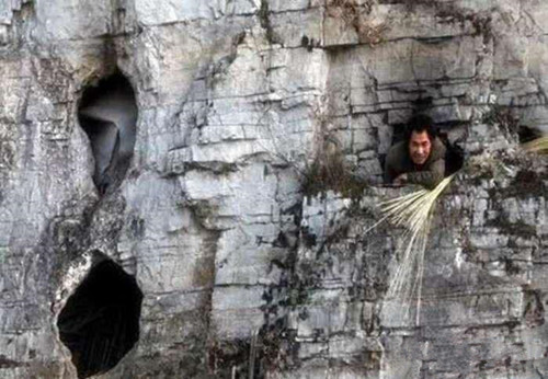 画面中可以按倒,山中有好几个洞口,男子趴伏在其中一个洞口处。旁边放置着一些稻草,这一幕俨然和电视剧中大圣被压在五指山下一模一样,看到这里大家不禁非常好奇,为什么这位竟然会被“压”在这里呢?难道是故意来这里玩耍留念的吗?