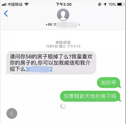事情的起因是这样的,我在5 8同城上发了一条房屋出租信息,然后收到了手机短信,短信内容很正常,问我房子租掉没有,想加微信了解下房屋状况。