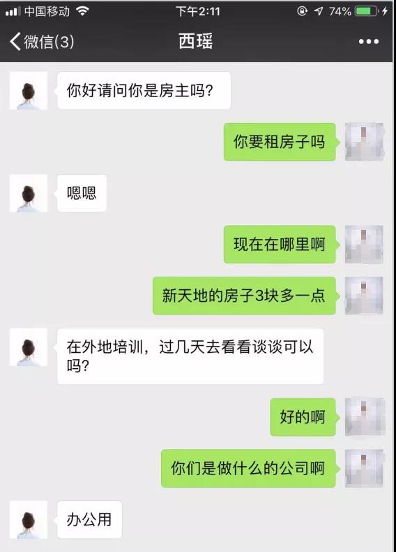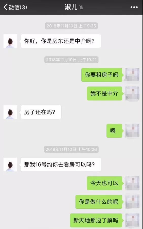 可是新“好友”如果没能一下识破这是骗局,在他们的朋友圈发完上面一个轮回后,就会有贪婪的人开始上钩了,会主动找他们聊天,或者在他们来询问房屋信息的时候被套进他们的圈套里去了。