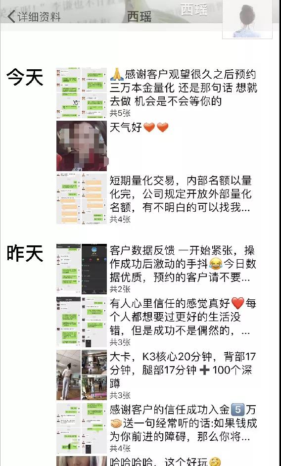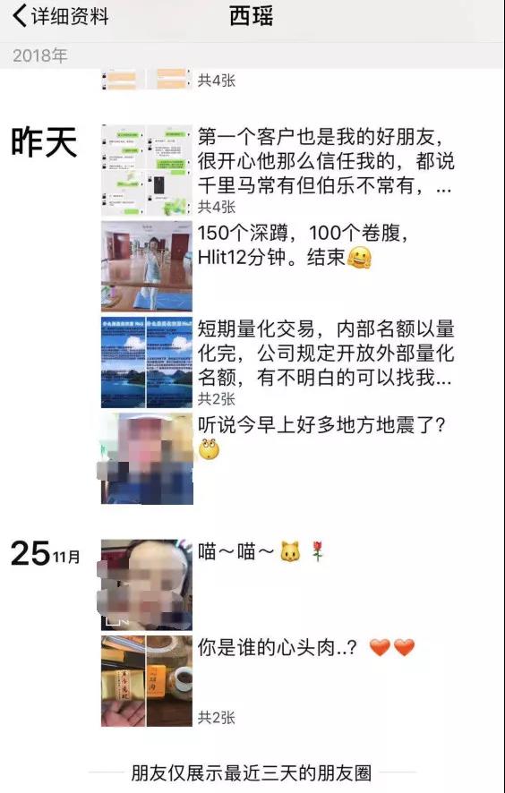 这巧合的有些蹊跷吧!于是我分别去翻她们的朋友圈,都是设置的只对人三天可见,朋友圈内容也几乎一样,全是有关量化交易的介绍和展示。