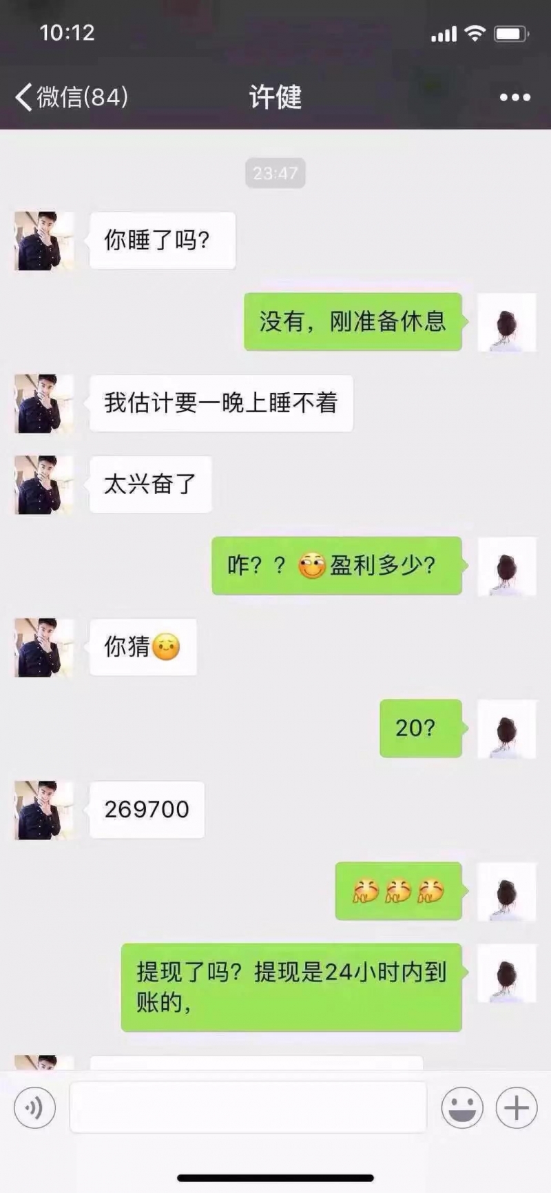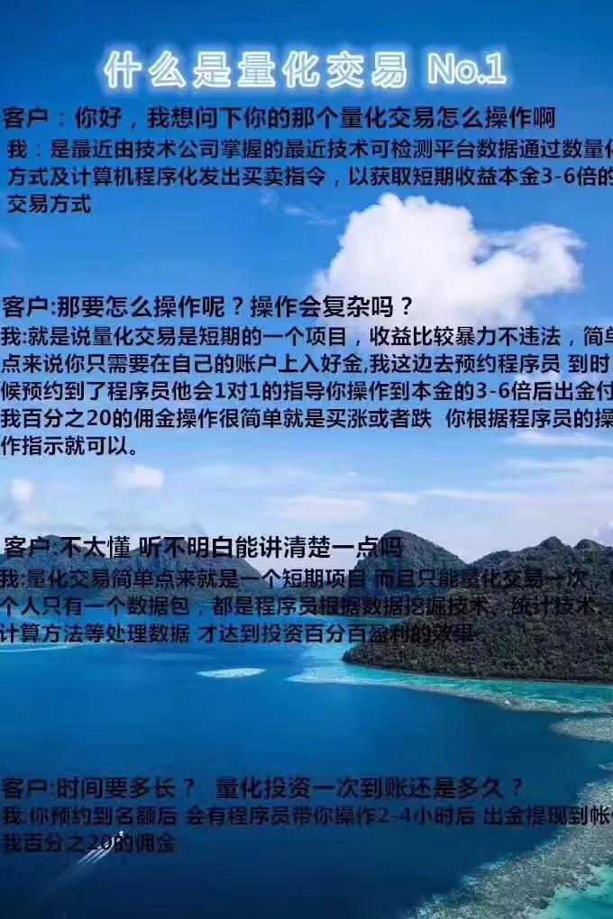 这让我更加肯定这些人就是骗子,这个所谓的量化交易就是用来骗人钱的,打着赚取佣金和手续费的幌子,来诱惑那些想要“躺赚”的人。我以前也加入过这种交易群,下载他们的交易软件,跟着里面的老师买涨买跌,一开始会给点甜头让我赚钱,可后面资金一加大就被套了。