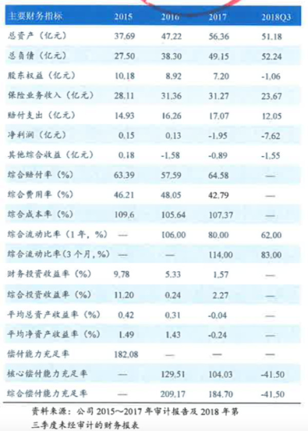 11月14日,长安责任保险延期披露的2018年三季度偿付能力报告显示,公司财务状况大幅恶化,核心偿付能力充足率、综合偿付能力充足率分别由上季度末的76.1%、152.3%降至-41.5%、-41.5%,远低于监管要求;2018年前三季度,公司合并口径净亏损7.62亿元;所有者权益由年初的7.16亿元下降至-1.06亿元。