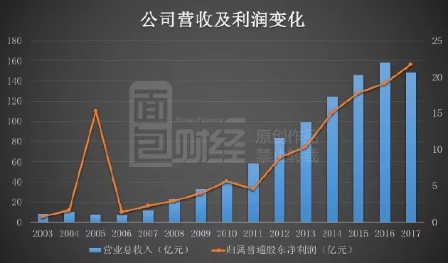 从2003年港交所主板上市至2017年,公司获得了不俗的增长,营业总收入从8.23亿上升到了148.58亿,年复合增速为22.96%,归属于普通股东净利润则从0.82亿上升到了21.71亿,年复合增速为26.37%。其中,2005年利润异常是因为当年出售附属公司山东正大福瑞达制药获得利润14.06亿港元所致。