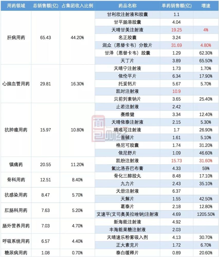 强劲的研发和销售能力使得公司2017年销售过亿产品超过了32个。我们根据公司公开数据整理了集团截至2017年底的主要产品销售情况。如下图所示,肝病、心脑血管、抗肿瘤以及镇痛用药贡献了集团超过80%的营收,其中肝病用药销售额达65.43亿,占据了国内肝病用药市场份额的24.4%。在集团的所有产品线中,年销售额超过10亿的品种有4个,分别是天晴甘美注射液、润众(恩替卡韦)分散片、凯时注射液以及凯纷注射液。