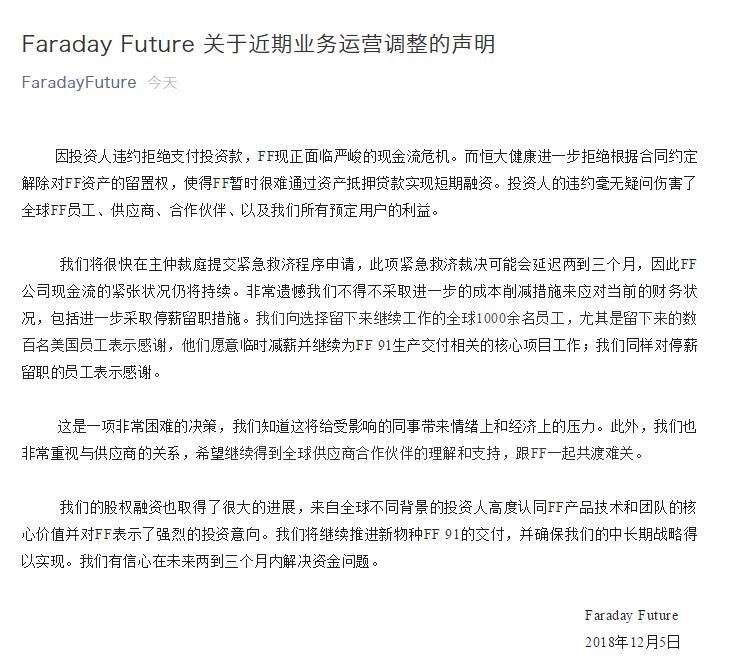 我们将很快在主仲裁庭提交紧急救济程序申请,此项紧急救济裁决可能会延迟两到三个月,因此FF公司现金流的紧张状况仍将持续。非常遗憾我们不得不采取进一步的成本削减措施来应对当前的财务状况,包括进一步采取停薪留职措施。我们向选择留下来继续工作的全球1000余名员工,尤其是留下来的数百名美国员工表示感谢,他们愿意临时减薪并继续为FF 91生产交付相关的核心项目工作;我们同样对停薪留职的员工表示感谢。