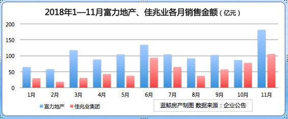 以富力为例,2018年12月2日富力公布的前11月销售业绩显示,11月单月,该公司合约销售总金额约为181.9亿元,销售面积达约159.82万平方米,环比分别上升109%、121%。蓝鲸房产翻阅公告发现,这是富力前11个月中,月销售额最高的月份。