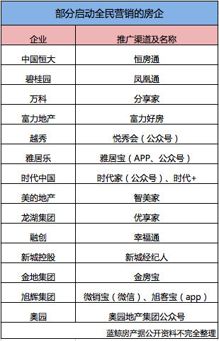 除了部分房企持续推出常规促销手段之外,还有不少房企也祭出了“全民营销”(企业通过互联网平台产品,带动线上、线下流量进行房产销售)的大旗。蓝鲸房产据公开资料不完全统计,目前已有14家房企推出了自己的APP或者微信公众号进行“全民营销”,另有部分房企也在线下进行全民营销。