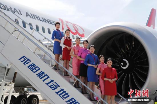 9月28日,上航波音787“梦想飞机”首航成都。图为身穿各个时代制服的乘务员在飞机边合影留念。 殷立勤 摄
