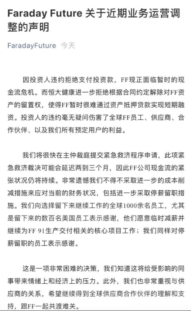 此次提出的紧急救济裁决可能会延迟两到三个月时间,FF“非常遗憾”地宣布不得不进一步采取成本削减措施来应对当前的财务状况,包括进一步采取停薪留职措施。AI财经社从FF内部人士处获悉,FF目前在全球大约有1000名员工,中国600人左右,美国400人左右。
