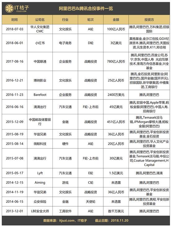2018 年,阿里巴巴和腾讯联手 2 次,共同投资了社交电商「小红书」以及传媒与娱乐产业集团「华人文化集团」。在过去的十年里,阿里巴巴和腾讯合作过 15 次,共同投资了滴滴、众安保险、微鲸科技等互联网公司,以及中国联通、华谊兄弟、博纳影业、中国邮政储蓄银行等巨无霸企业。阿里巴巴与腾讯合投事件见下表: