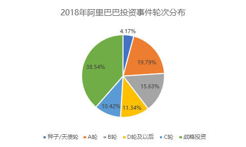 从阿里巴巴在 2018 年的投资轮次来看,阿里巴巴在 2018 年还是以中后期投资为主,尤其偏爱战略投资。其中,战略投资的占比在所有轮次中是最高的,占比接近四成(约为 38.54%);早期投资(种子/天使轮、A 轮)占比 23.96%,中期投资(B、C 轮)占比 26.04%。