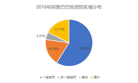 从阿里巴巴在 2018 年的投资区域分布来看,一线城市(北京、上海、深圳、广州)占比接近六成,非一线城市占比不足两成。此外,阿里巴巴在港台以及海外的投资布局也异常活跃,合计占比两成左右。