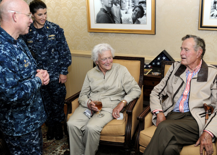 老布什和芭芭拉,会见“布什”号航母上的水兵 图源:美国海军