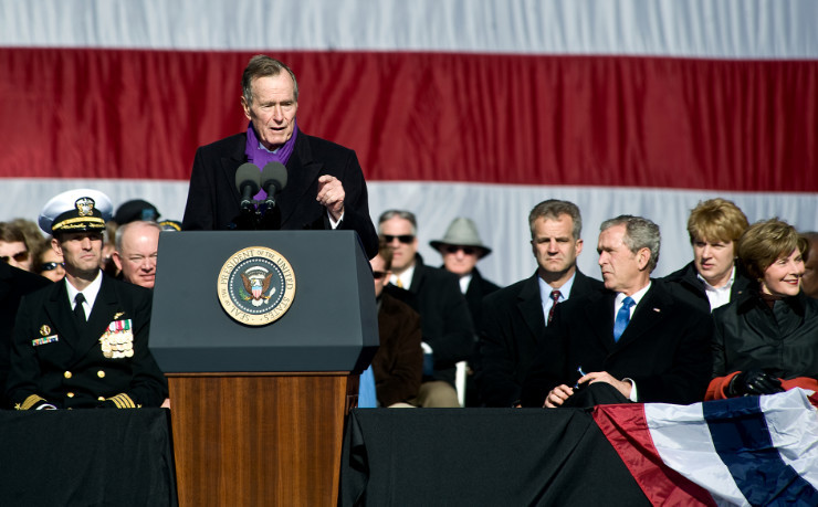 2009年1月10日,在美国弗吉尼亚州诺福克海军基地,前总统、乔治·H·W·布什在美国海军“乔治·H·W·布什”号航空母舰(CVN 77)的服役典礼上对观众讲话 图源:美国海军