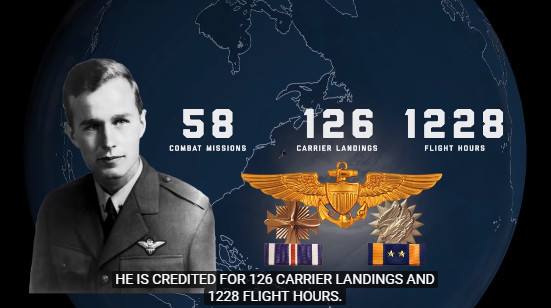 1944年,在一次轰炸任务中被击落后,布什被一艘潜艇救起,并因此获得“飞行十字勋章”。一回到他的航空母舰“圣哈辛托号”(USS San Jacinto,CVL-30),老布什就继续重新回到作战之中。他是最后一名向着“大和”号战列舰俯冲过的海军航空兵飞行员。