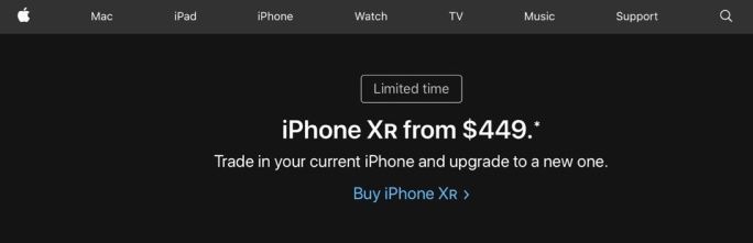 12月2日,苹果又进一步加大了iPhone促销力度,在其官网上打出了新的条幅广告,iPhone XR仅售499美元,较之前的官方价格低300美元。当然,这样的优惠力度也是有条件的,需要用户用iPhone 7 Plus以旧换新。