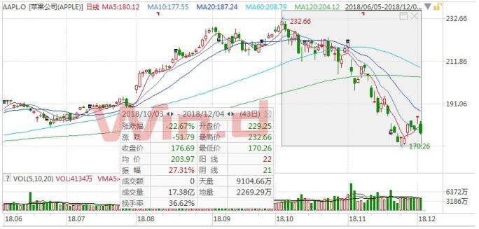 受此影响,苹果股价也是直线坠落,周二股价重挫4.4%,报176.69美元,相较10月份高点,跌幅高达22%,市值缩水近1700亿美元。