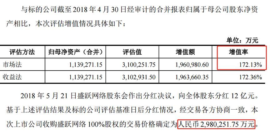 根据交易报告书,截至2018年4月30日,盛跃网络100%股东权益评估结论采用市场法评估结果,约310.03亿,增值率约172.13%。不过5月21日,盛大游戏向原股东分红12亿元,经协商交易价格确定为约298亿元(2,980,251.75万元)。