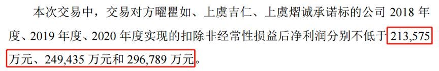 根据公告,相关交易方承诺盛跃网络2018-2020年实现的扣除非经常性损益后净利润分别不低于213,575万元、249,435万元和296,789万元,三年合计约75.98亿元。