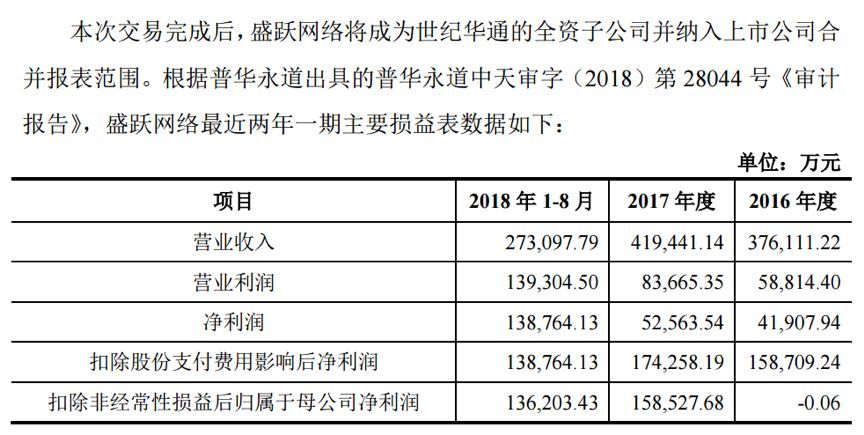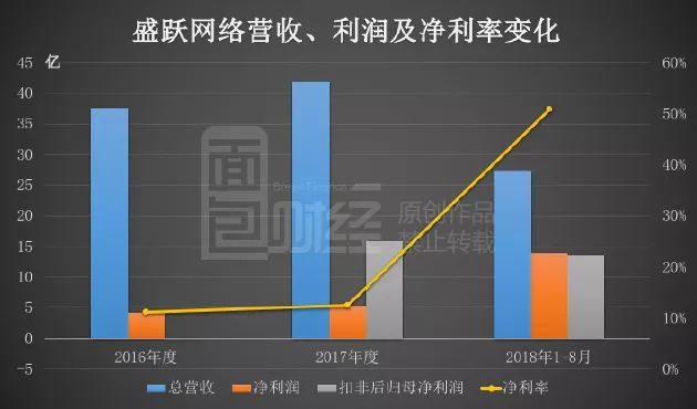 根据交易报告书,2018年1-8月,盛跃网络营业收入27.31亿元,净利润13.88亿元,扣非后归母净利润13.62亿元。也就是说,若盛跃网络要达到2018年业绩承诺,在剩下的4个月里扣非后归母净利润需超过7.7亿元。