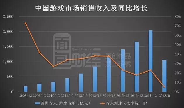 根据中国音数协游戏工委公布的数据,2018年1-6月,中国游戏市场实际销售收入约1050亿元,同比增长5.2%,增速较上年同期下降了21.47个百分点,自2008年以来首次跌入个位数。
