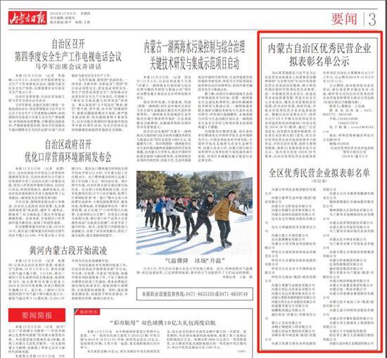 根据内蒙古自治区党委办公厅、政府办公厅《关于开展全区优秀民营企业评选表彰活动的通知》(内党办发电〔2018〕29号)精神,通过广泛征求意见,由各盟市党委审核推荐,并征求自治区相关部门意见,经自治区优秀民营企业评选表彰领导小组审议,并经自治区党委、政府主要领导批准,现将52家拟表彰企业予以公示。按内党办发电〔2018〕29号要求,自治区优秀民营企业拟表彰名单须在自治区主要媒体公示5个工作日,公示期为2018年12月5日至12月11日。