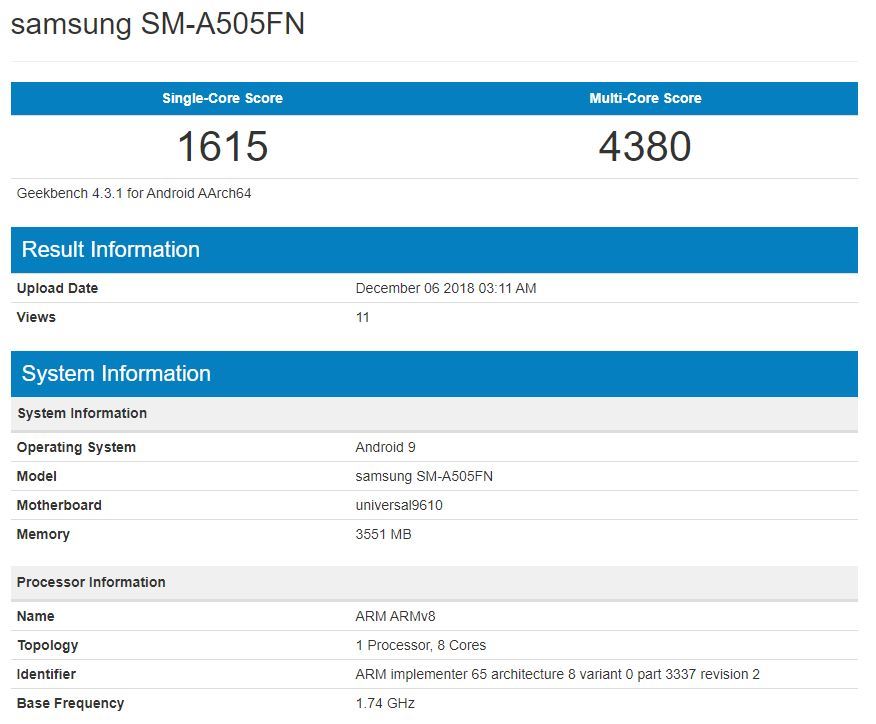 此前小雷已经陆续报道了Galaxy M20、A8s等多款三星新机的消息,可以看出三星正在有条不紊地更新旗下产品。近日,一款型号为SM-A505FN的产品出现在GeekBench跑分库之中,外媒Sammobile认为,这应该是明年A系列产品线的新机Galaxy A50。