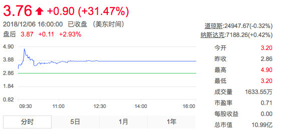 截至12月6日美股收盘,优信报收3.76美元,涨幅31.47%,盘中一度大涨66.08%,市值飙升至14亿美元。