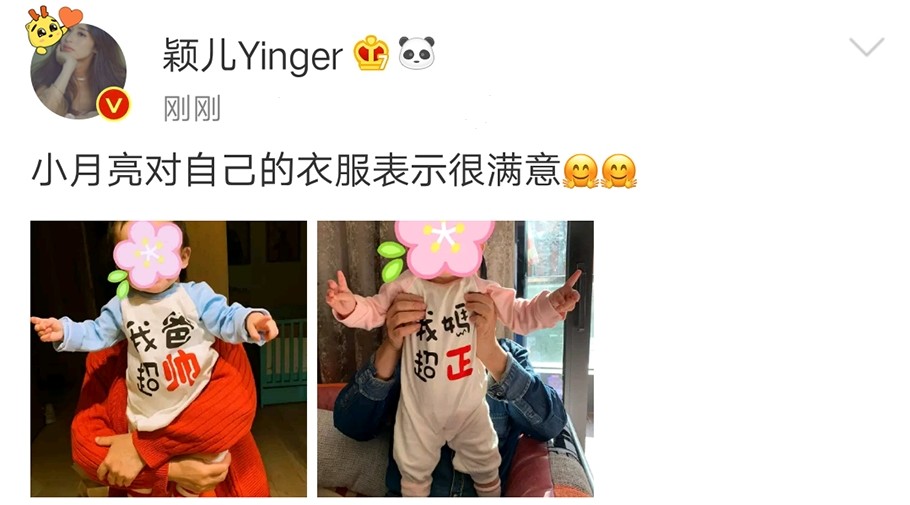 原标题:颖儿难得晒女儿萌照 小月亮衣服上文字抢镜 小手比耶超满意