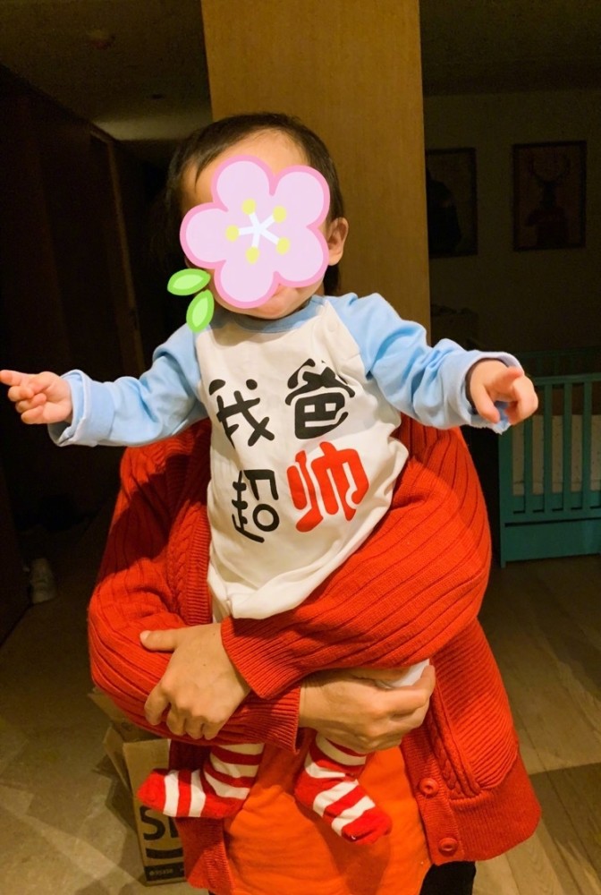 照片中,小月亮穿着蓝色袖子的连体裤,搭配一双圣诞袜,萌态十足,衣服上的文字很抢镜:我爸超帅!小月亮的头发还不是很浓密,但是相信她会是个潜力股,头发会越来越多的。至少目前小公主的皮肤是非常白皙的,都说一白遮百丑,更何况爸爸妈妈颜值都这么高,孩子肯定也会很漂亮!隔着一朵花都能感受到小月亮笑得很开心,好想看宝贝的正面照!