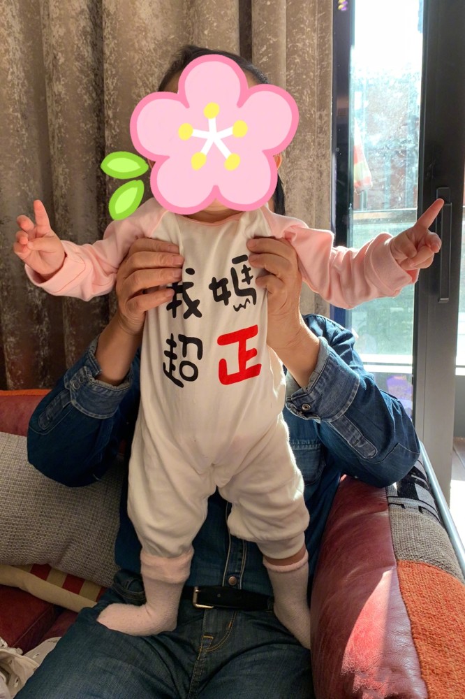 后来小月亮又换了一套衣服,还是一样的款式,只是颜色变了一下,衣服上换了文字,变成了“我妈超正”!更有意思的是小家伙的手指头竟然在比耶,要知道剪刀手对于这个年龄的孩子来说难度是相当大的,小月亮能做到这个程度,已经让人足够惊喜了!同时也能看出小公主确实对于自己的新衣服相当满意!