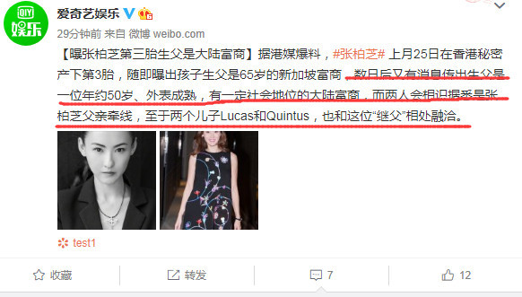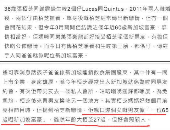 港媒爆料张柏芝第三胎是新加坡富豪,现在咱们的媒体出来凑热闹,大概就是“据港媒爆料”这个意思。不管这个料是谁说的,反正这次张柏芝第三胎这个孩子的生父又变了,变成了大陆富商,只有50岁左右。
