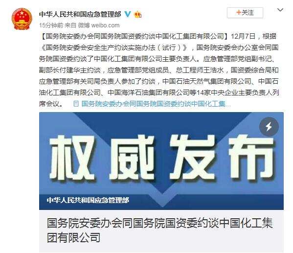 人民网北京12月7日电 据应急管理部官方微博消息,12月7日,根据《国务院安委会安全生产约谈实施办法(试行)》,国务院安委会办公室会同国务院国资委约谈了中国化工集团有限公司主要负责人。应急管理部党组副书记、副部长付建华主约谈,应急管理部党组成员、总工程师王浩水,国资委综合局和应急管理部有关司局负责人参加了约谈,中国石油天然气集团有限公司、中国石油化工集团有限公司、中国海洋石油集团有限公司等14家中央企业主要负责人列席会议。
