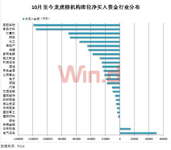 自今年10月以来,龙虎榜机构席位买入金额77.57亿元,卖出金额146.7亿元,净卖出超过60亿元。其中医药、食品饮料和计算机三个板块净卖出金额居前,分别为11.9亿元、11.55亿元和7.05亿元,三行业合计为30.51亿元,占比近一半。