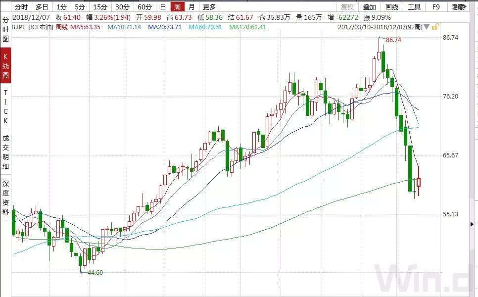 布伦特原油期货一度大涨6%,最高报63.73美元/桶;截至收盘,布伦特原油期货收涨2.23%报61.40美元/桶,本周涨3.26%。
