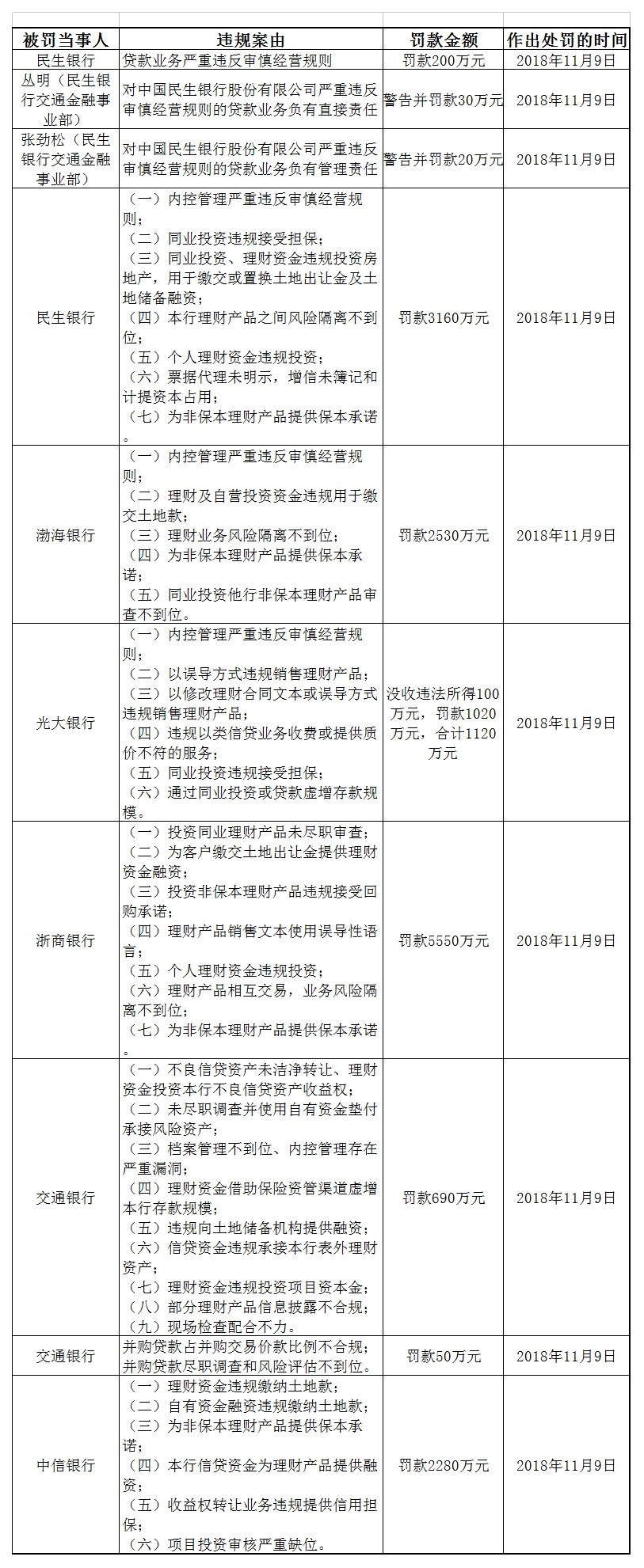 12月7日晚间,银保监会一次性披露10张罚单,涉及民生银行、渤海银行、光大银行、浙商银行、中信银行、交通银行等6家银行,以及2名相关责任人,合计处罚1.563亿元。
