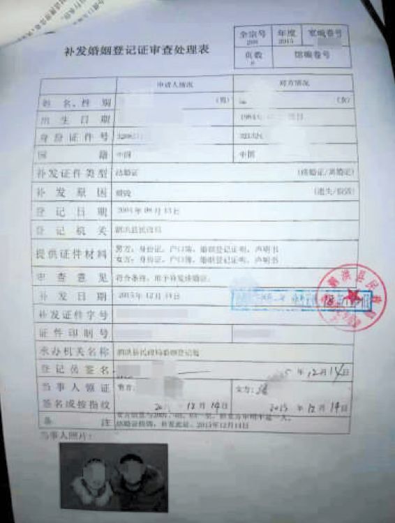 泗洪县民政局提供给新京报记者的两份《婚姻登记审查处理表》显示,两个“潘霞”的性别、出生年月、身份证号完全一致,不过照片和登记的家庭住址却出现了差异。