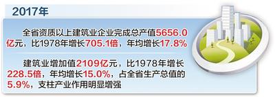 河北省统计局的统计数据显示,2017年,全省资质以上建筑业企业完成总产值5656.0亿元,比1978年增长705.1倍,年均增长17.8%;建筑业增加值2109亿元,比1978年增长228.5倍,年均增长15.0%,占全省生产总值的5.9%,支柱产业作用明显增强。
