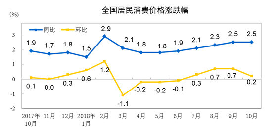 国家统计局数据显示,10月份全国居民消费价格同比上涨2.5%,与上月持平,但涨幅仍处于“2时代”。